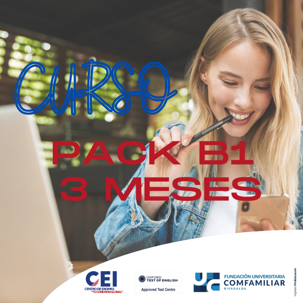 Para ingresar a nuestro curso Pack B1, el estudiante deberá contar con un nivel de competencias A2 de inglés, el cual puede ser justificado a través de cursos realizados previamente o por medio de la prueba de nivelación realizada en el centro de idiomas.                                                                                          Nuestra oferta académica para el curso Pack B1 brinda la posibilidad a nuestros estudiantes de realizar los cursos con horarios flexibles en semana.                                                              El estudiante recibirá al final del proceso la certificación de competencias del nivel B1 de inglés, esta certificación está avalada bajo resolución de la Secretaría de Educación Municipal de Pereira.