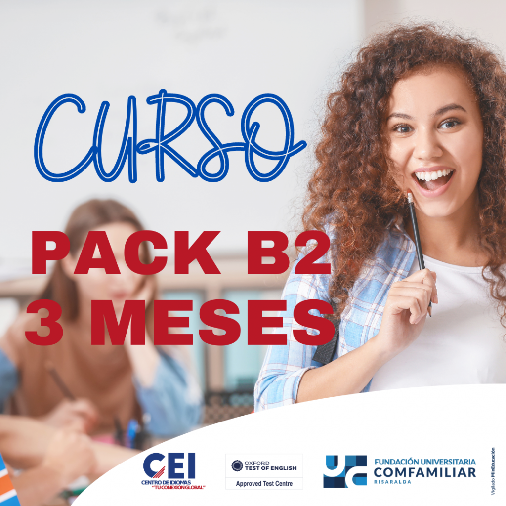Para ingresar a nuestro curso Pack B2, el estudiante deberá contar con un nivel de competencias B1 de inglés, el cual puede ser evidenciado a través de cursos realizados previamente o por medio de la prueba de nivelación realizada en el centro de idiomas.                                                                                        Nuestra oferta académica para el curso Pack B2 brinda la posibilidad a nuestros estudiantes de asistir a clases presenciales los días sábados.                                                           El estudiante recibirá al final del proceso la certificación de competencias del nivel B2 de inglés, esta certificación está avalada bajo resolución de la Secretaría de Educación Municipal de Pereira.