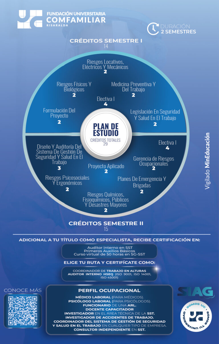 Perfil de ingreso: El aspirante a la Especialización en Higiene y Seguridad Industrial es un profesional universitario graduado en cualquier área del conocimiento, interesado en adquirir competencias específicas para la identificación, evaluación y control de riesgos en los entornos laborales, con el fin de promover ambientes de trabajo seguros, saludables y en cumplimiento de la normativa legal vigente.