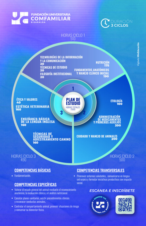 Objetivo del programa: Formar Auxiliares de Clínica Veterinaria con habilidades para cuidar, alimentar, higienizar y manejar animales de compañía, aplicando protocolos técnicos, promoviendo el bienestar animal y desarrollando un perfil emprendedor en un entorno ético y profesional.